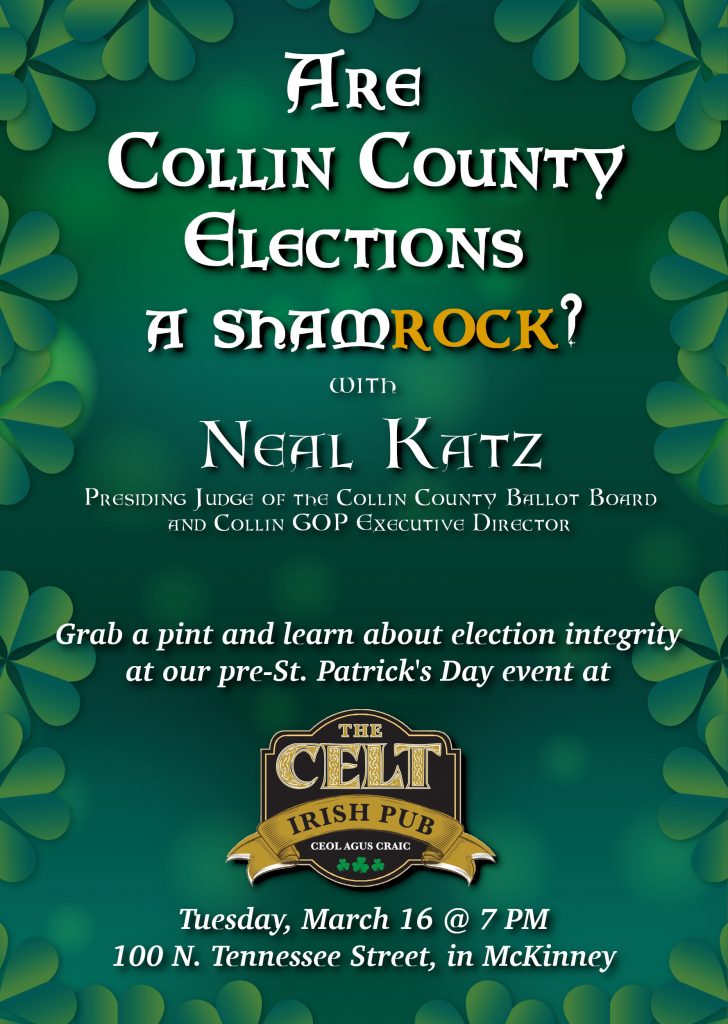 Elections, down Pat. Please join us at The Celt in historic downtown McKinney to both celebrate St Patrick’s day and discuss with Neal Katz, Presiding Judge of the Collin County Ballot Board and Collin GOP Executive Director, how Collin County is keeping our local elections secure.