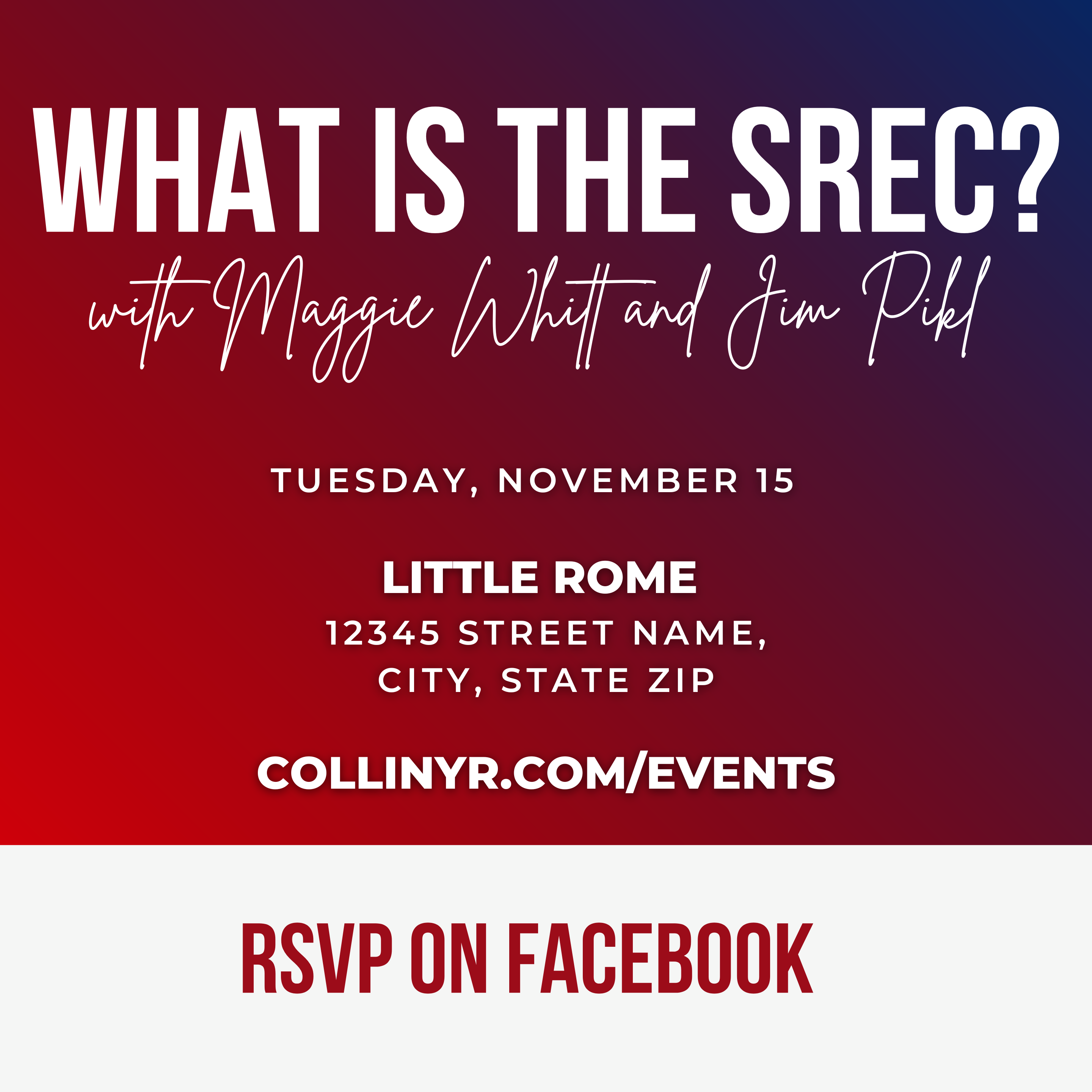« All Events This event has passed. What is the SREC? November 15, 2022 @ 6:30 pm - 9:30 pm « Congressional Update with Rep Van Taylor Connecting with the Latino Community » November Meeting with SREC Committee Members Jim Pikl and Maggie Whitt. + Google Calendar+ iCal Export Details Date: November 15, 2022 Time: 6:30 pm - 9:30 pm Website: collinyr.com Venue Little Rome 2707 W 15th St Plano, 75075 United States + Google Map Organizer Collin County Young Republicans Website: https://www.eventbrite.com/o/collin-county-young-republicans-7666948571